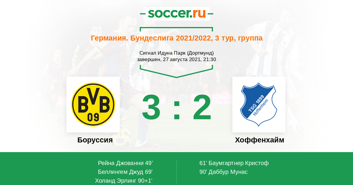 Боруссия – Хоффенхайм / Боруссия - Хоффенхайм: прогнозы 27 августа 2021 | СТАВКА TV - 🔥 «боруссия» и «хоффенхайм» выдали шоу (3:2), а холанд забил победный мяч в добавленное время!